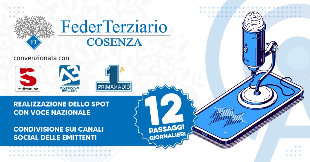 FederTerziario Cosenza ha stipulato un accordo che offre agli associati prezzi agevolati per spot radio sulle emittenti radio tra le più conosciute e ascoltate in Calabria e provincia di Cosenza: Radio Sound, Antenna Bruzia e PrimaRadio.